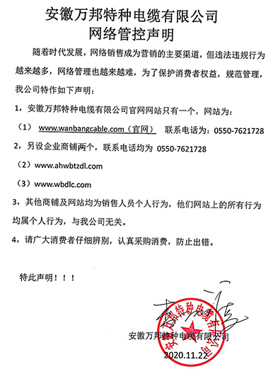 鄭重聲明:安徽萬邦特種電纜有限公司官方網站為:www_wanbangcable_com.n9133.cn,除此之外無任何子網站或合作網站,其余均為假冒偽劣。電話:0550-7621728 13485756353 地 址:安徽省天長市滁州高新技術產業開發區經四路29號